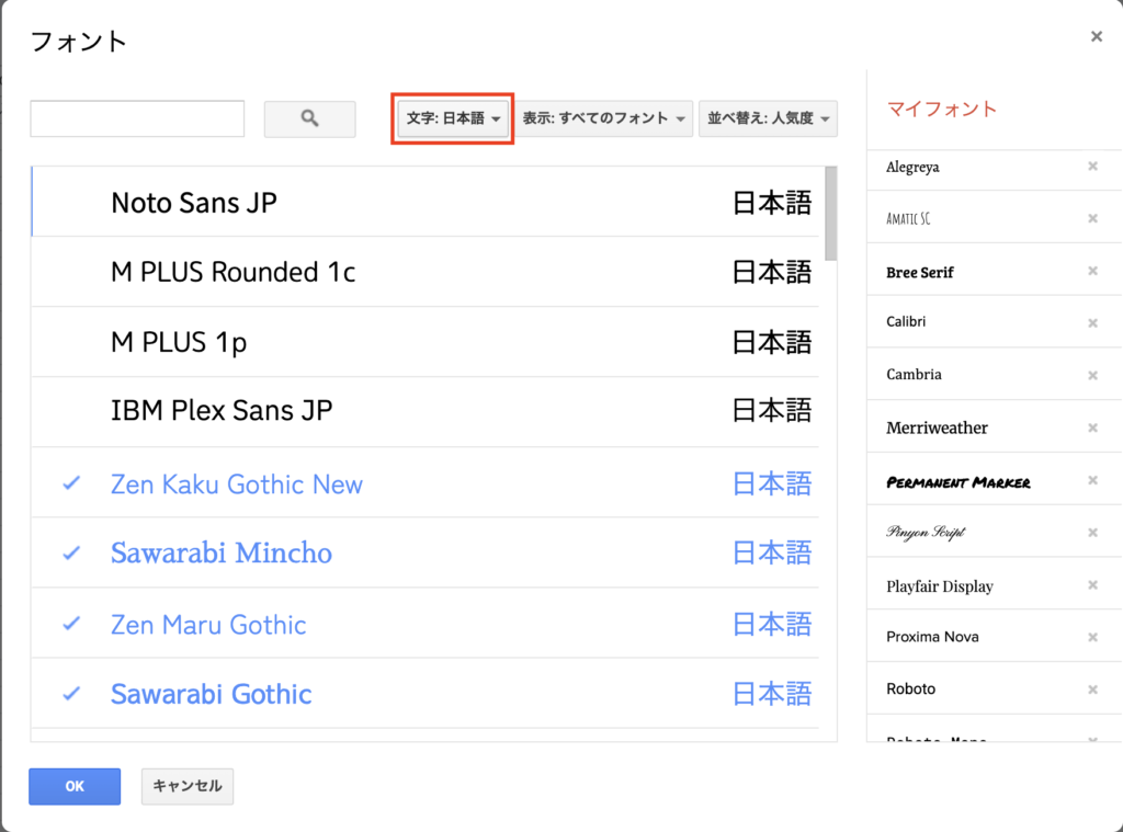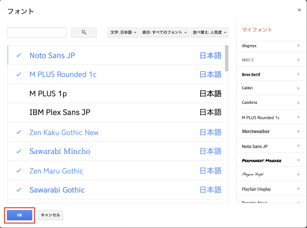 使いたいフォントをクリックすると、左側にチェックが入ります。複数選んでもOKです。