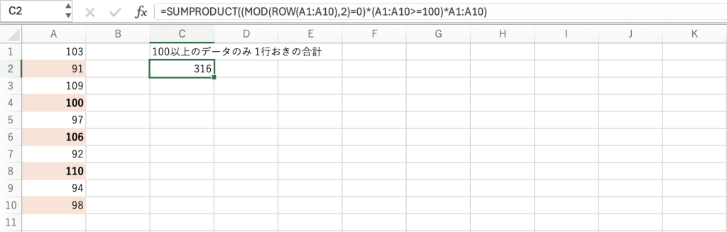 =SUMPRODUCT((MOD(ROW(A1:A10),2)=0)*(A1:A10>=100)*A1:A10)