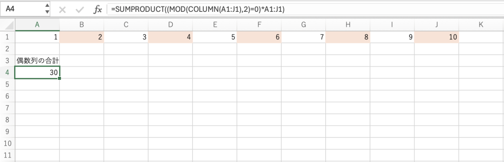 =SUMPRODUCT((MOD(COLUMN(A1:J1),2)=0)*A1:J1)
