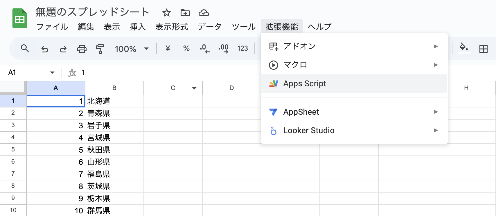 - 対象のスプレッドシートを開き、上部メニューの「拡張機能」>「Apps Script」を選択します。