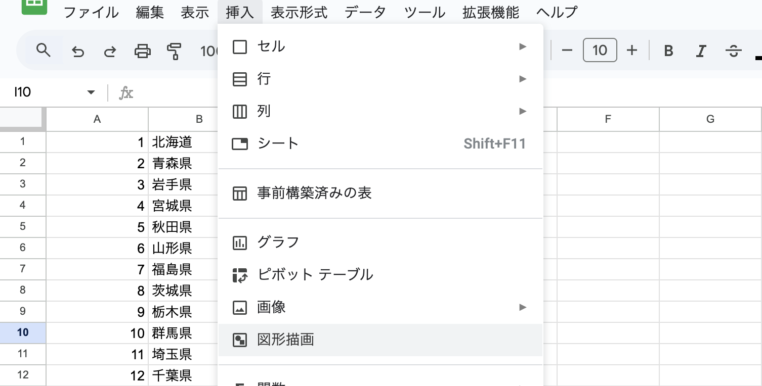 - スプレッドシートのメニュー「挿入」>「図形描画」を選択します。