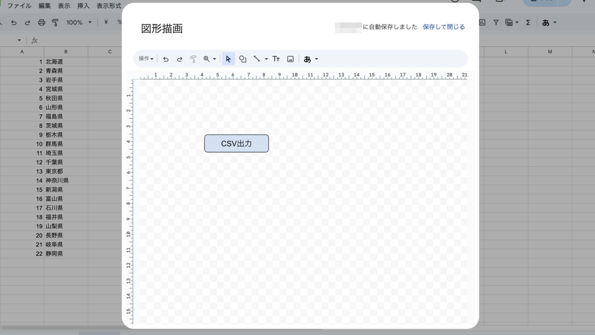 - 好きな形の図形(例:角丸長方形)を描き、中に「CSV出力」などのテキストを入力して「保存して終了」します。