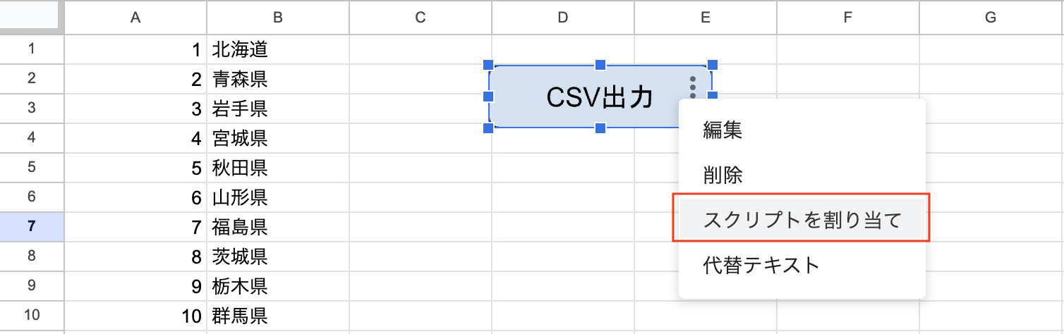 - シート上に配置された図形の右上にある「︙」メニューをクリックし、「スクリプトを割り当て」を選択します。