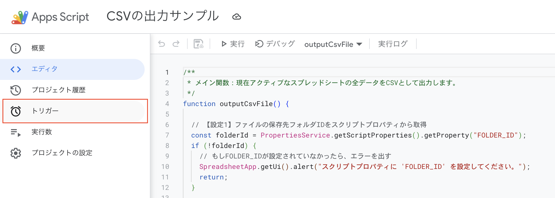 - エディタ上部の関数選択が outputCsvFile になっていることを確認し、「実行」ボタンをクリックします。