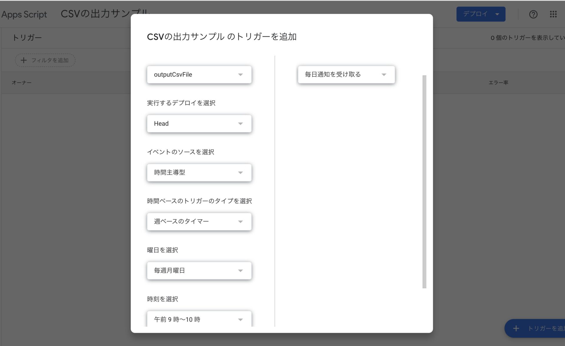 - 実行する関数を選択: outputCsvFileイベントのソースを選択: 時間主導型時間ベースのトリガーのタイプを選択: 週タイマー曜日を選択: 毎週月曜日時刻を選択: 午前 9 時~10 時