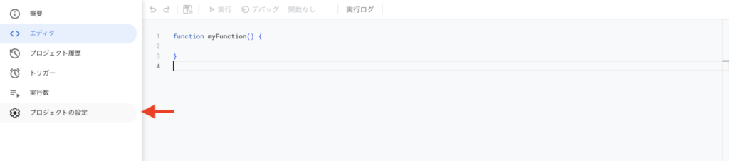 GASのエディタを開き左側のメニューにある、歯車のアイコンの「プロジェクトの設定」をクリックします。