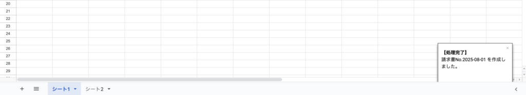 SpreadsheetApp.getActiveSpreadsheet().toast('請求書No.2025-08-01 を作成しました。', '【処理完了】');