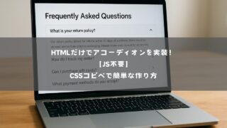 Web開発 Web開発 CSSHTMLWebデザインWordPressアクセシビリティ初心者向け HTMLだけでアコーディオンを実装!【JS不要】CSSコピペで簡単な作り方 JS不要!HTMLだけでアコーディオンを作る簡単な方法を解説。CSSをコピペするだけで、初心者でも軽量でアクセシブルなUIが実装できます。タグの基本からデザインの応用まで網羅。 2022.10.15 Web開発