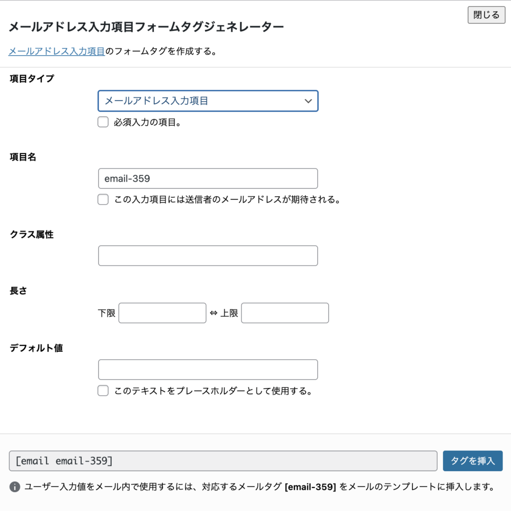 Contact Form 7では、メールアドレス入力欄をフォームタグ生成ダイアログを使って直感的にカスタマイズできます。